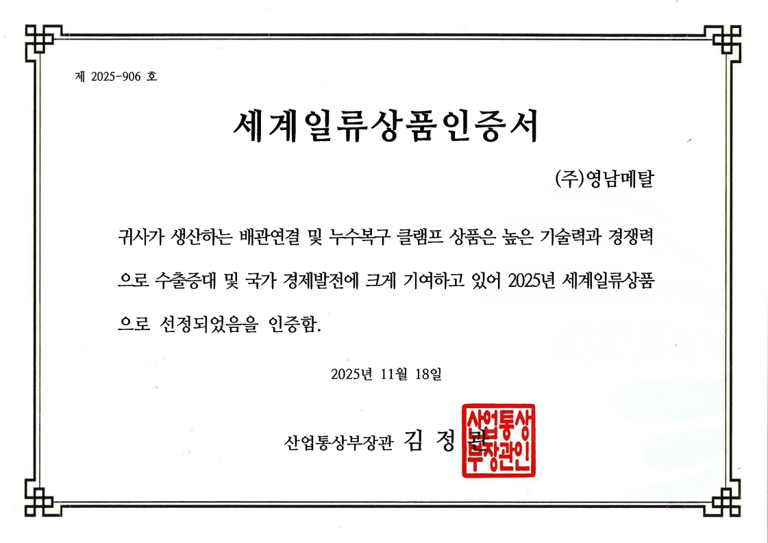 (주)영남메탈은 1986년 5월 이화산업으로 사업을 시작하여 배관자재 부품인 배관 연결구(Pipe Coupling) 및 무단 누수복구 클램프를 전문 생산하는 업체입니다. 항상 저희 (주)영남메탈을 도와주시고 이끌어 주신 여러분들께 감사의 마음을 전하며, 지속적인 협력과 협조를 부탁드리고 함께 발전해 나갈수 있도록 지도편달 바랍니다.